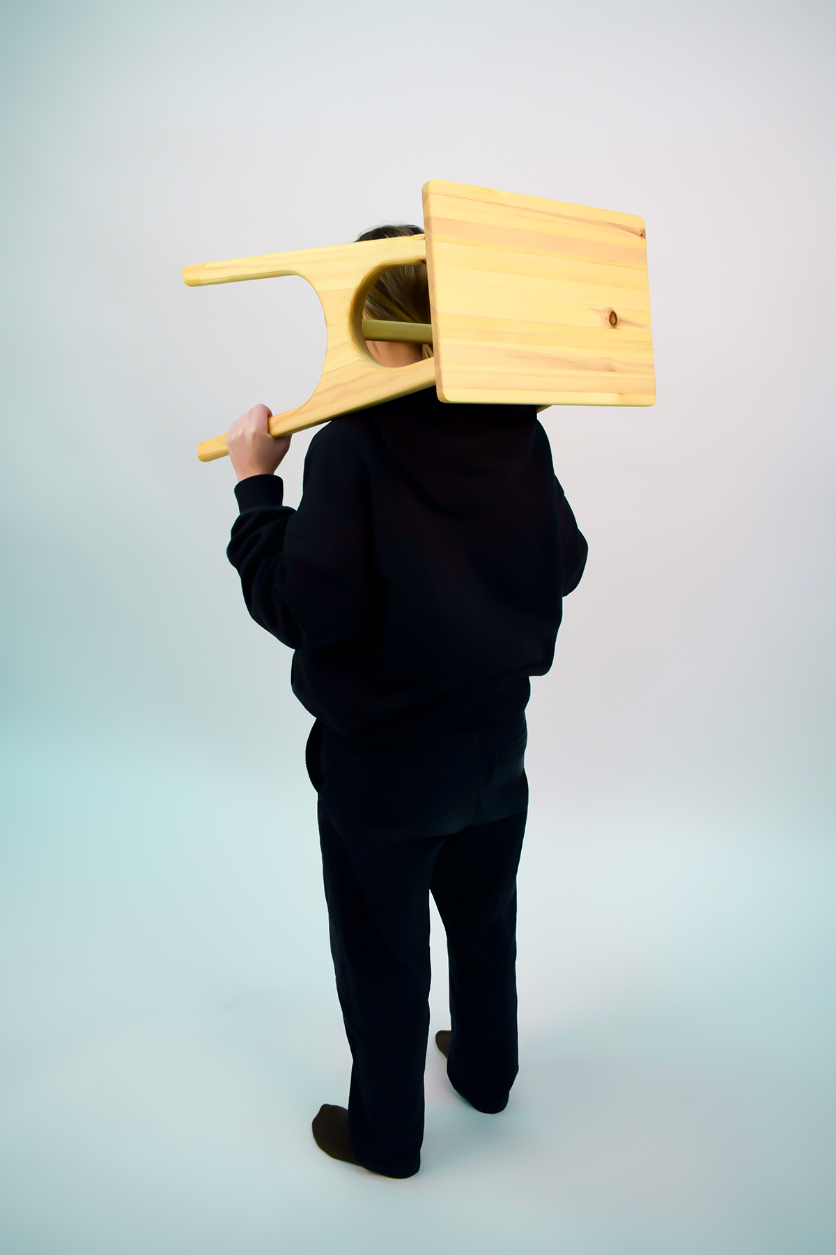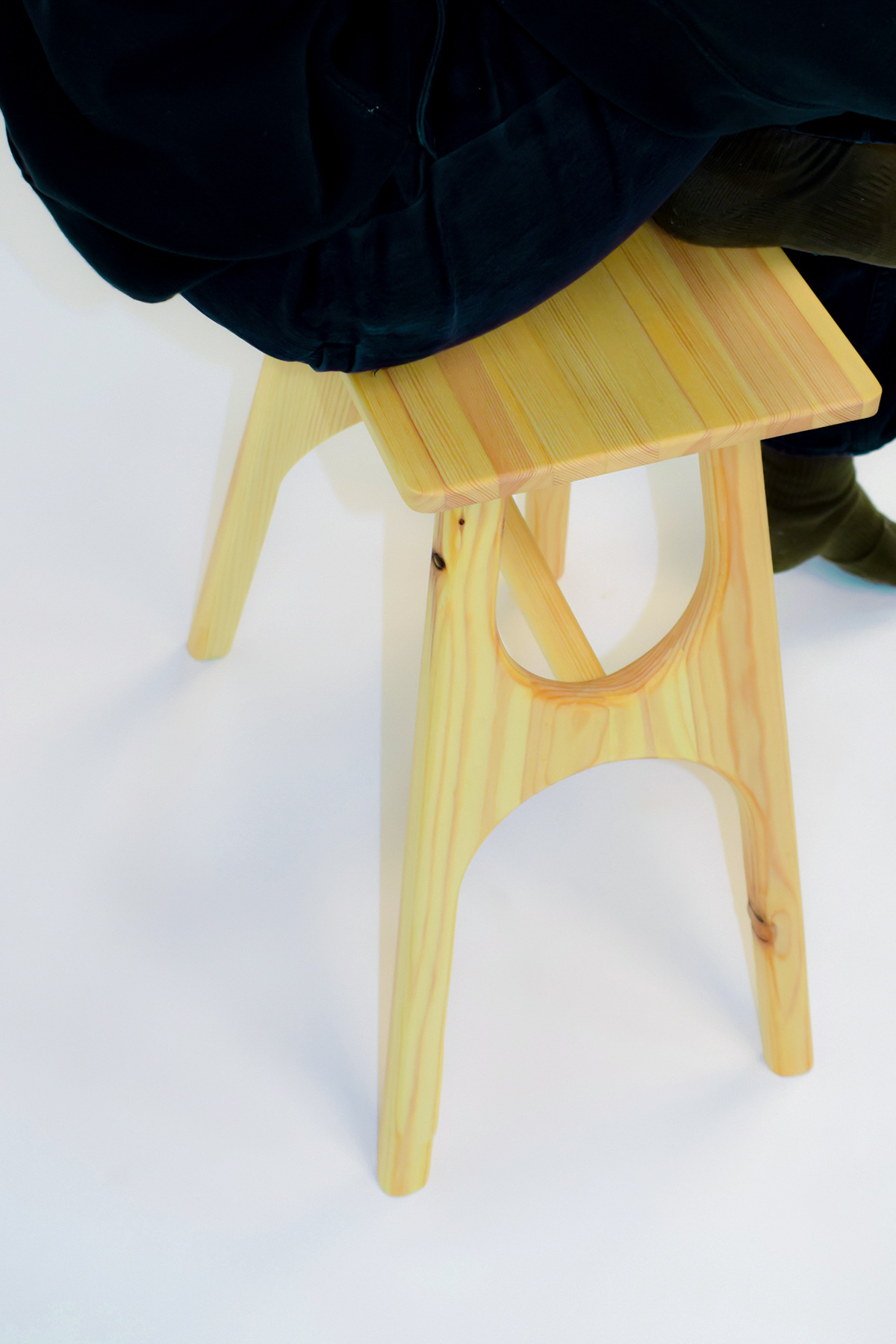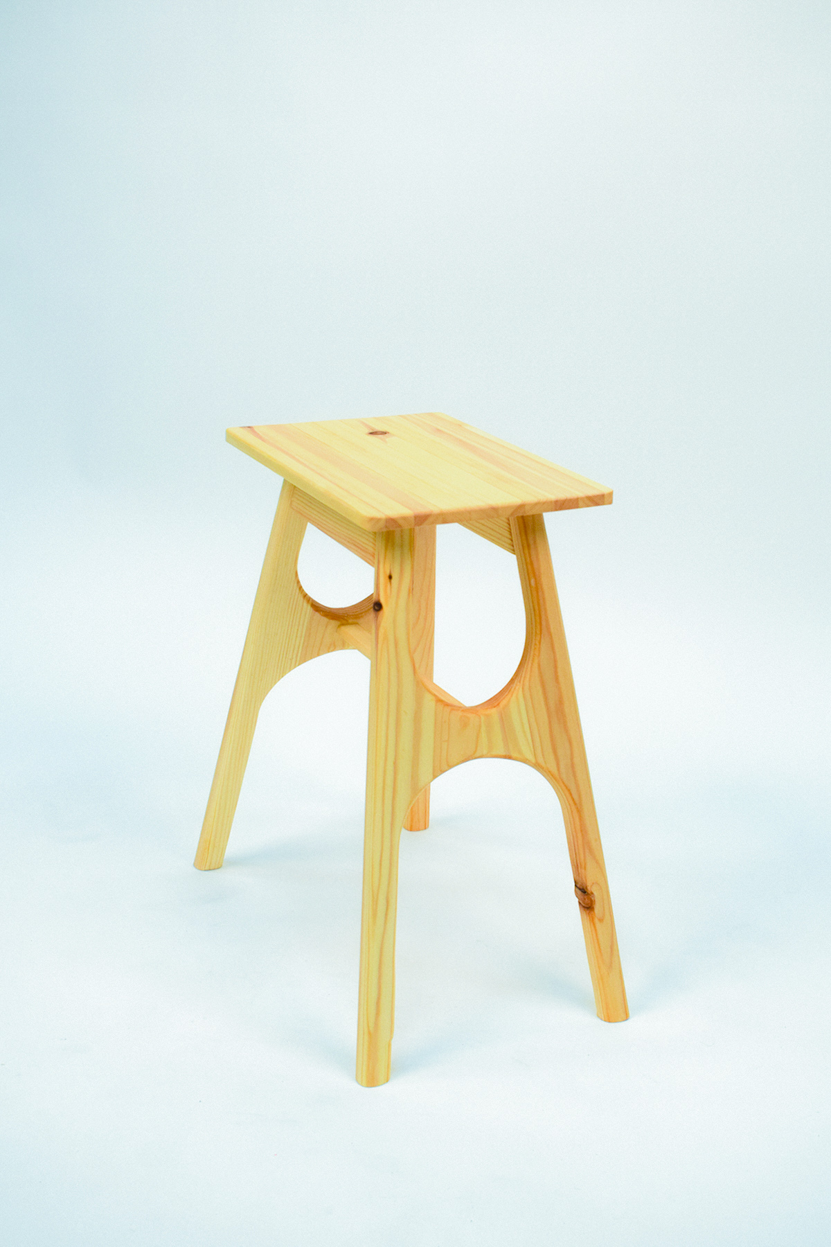 A stool made from a wooden board with a width of 6 centimeters and a thickness of 3 centimeters. The process took 2 months and involved learning about wood in the workshop. This included creating models, a floor plan, and a 1:1 scale model.